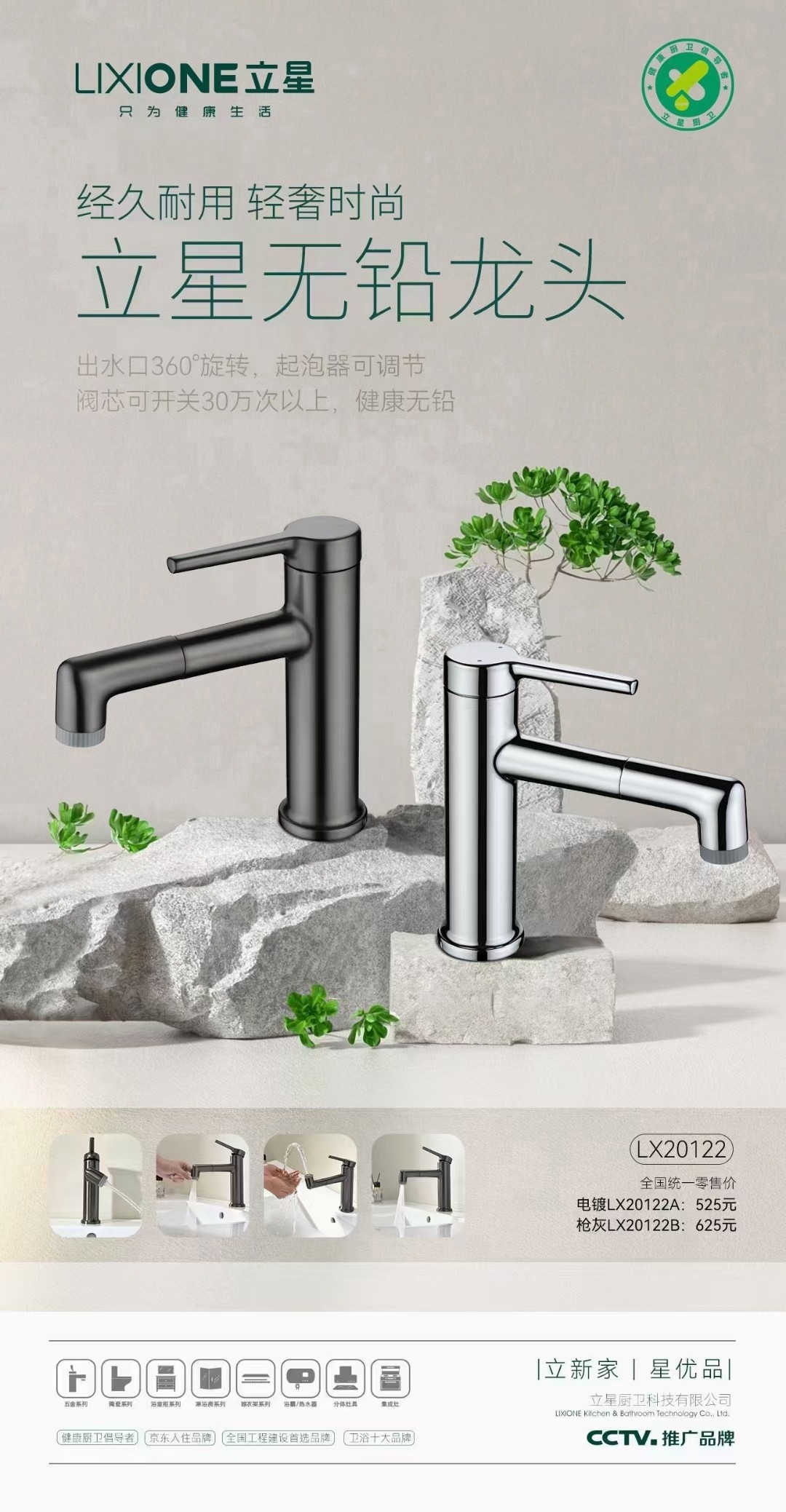 立星产品设计秉承中欧式风格,目前主推中式风情、超级洁净的品牌理念。产品包括五金系列、卫生陶瓷系列、感应洁具、大小便冲洗阀、不银钢厨盆、浴室柜、水箱、淋浴房等系列配套产品。